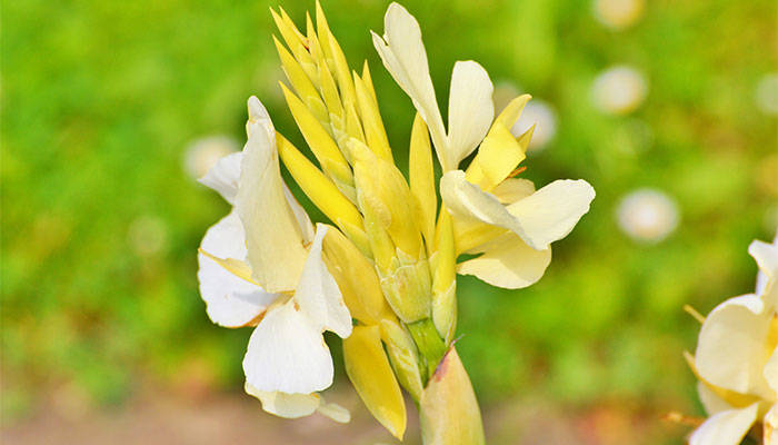 黄花美人蕉:一种宿根草本植物,总状花序花开色黄自成一景。黄花美人蕉的花大色艳、开花多,适合成片种植、丛植,可作为园林绿地装饰草本花卉。