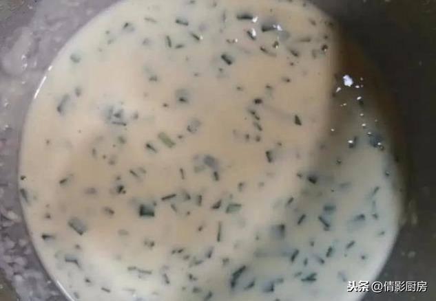 2.面糊中加入鸡蛋、适量盐、韭菜碎搅匀。