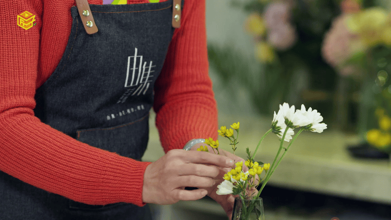 3.把花材反过来,根据花器的高度进行一个修整,一定要记得是斜剪,建议45度斜剪加入瓶子里面;