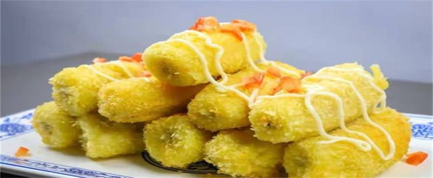 此时我们将香蕉剥皮,然后整根都放到碗里面。这时候香蕉表面就会裹上一层面糊,之后再放入盘子当中,盘子里面需要放上面包糠。小伙伴们裹好面包糠之后,再轻轻地抖入多余的面包糠。