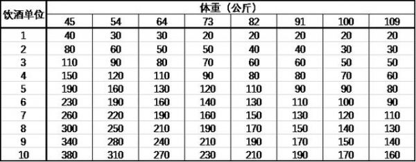 表中的“饮酒单位”是指含有大约18毫升酒精的酒,比如30毫升60度白酒、355毫升(12盎司)5度酒精的啤酒或者150毫升12度的葡萄酒等等。表中的数字,是指1小时内喝下相应饮酒单位后的血液酒精浓度,数字是百分比,乘以1000就得到中国通常所用的血液酒精含量值“毫克/100毫升”。