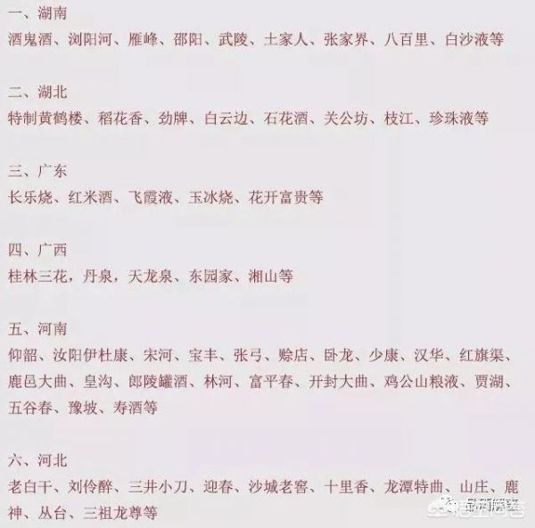 中国酒文化历史悠久,全国大大小小的白酒厂家有上万家之众,规模以上的白酒厂家也有几千家之多。每个省也都有自己的代表性名酒,下面就一一列举如下: