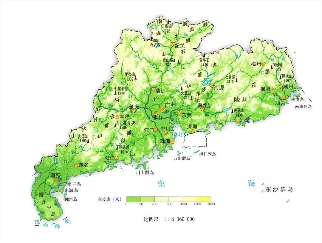 广东省地形特征:以山地、丘陵地形为主,珠江三角洲地区地势低平。