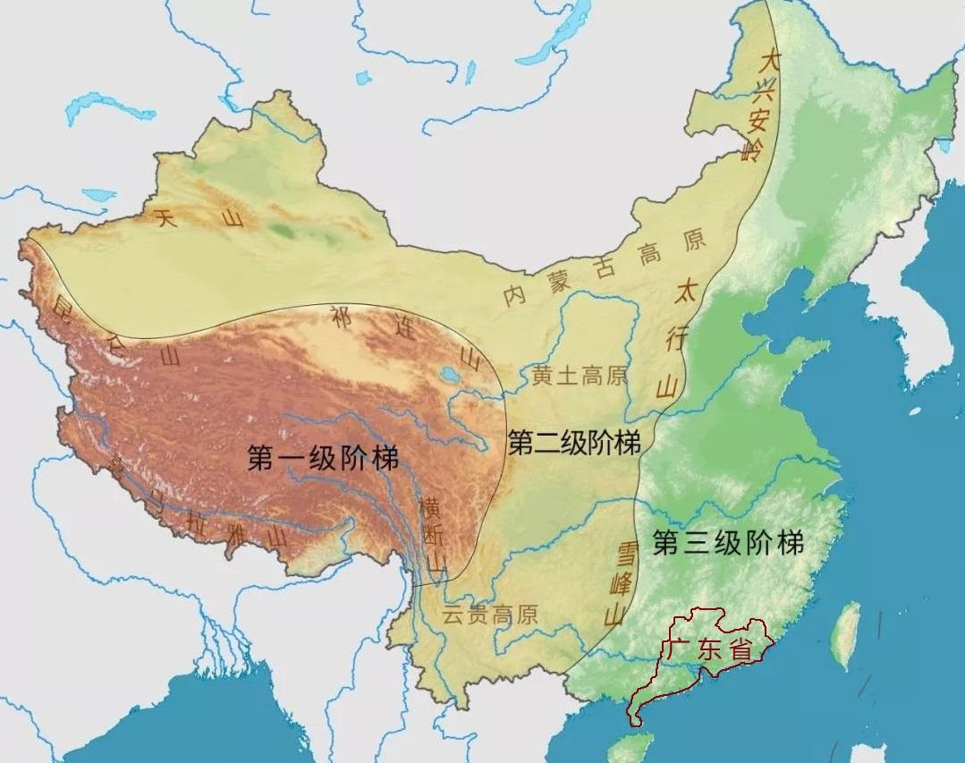 从广东省的轮廓来看,就像是一个东北宽西南窄放置的鸡腿,而雷州半岛就是这只“鸡腿”的骨头,广东省东西跨度较大,而南北跨度相对较小。从我国地势的三级阶梯分布来看,广东省位于地势最低的第三级阶梯。