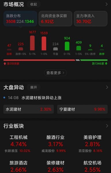 市场今天是一个平稳的上升走势,成交量相较于上周明显增大了,就连上周四的大涨那天 都没有今天的成交量,这说明什么问题?1、上周四是触碰20日均线反弹,资金对于后市看好的一致性高,都不愿交出筹码,那么在缩量的情况下也会拉升。2、今天明显看到资金在寻找方向,也在追高一些方向,在这个时候是需要有一定的敏感度才能准确找到资金流向。3、红黄线的距离没有拉开,而大盘涨了0.72%的情况下,还有1300余家飘绿,说明资金注入大盘股比较多。