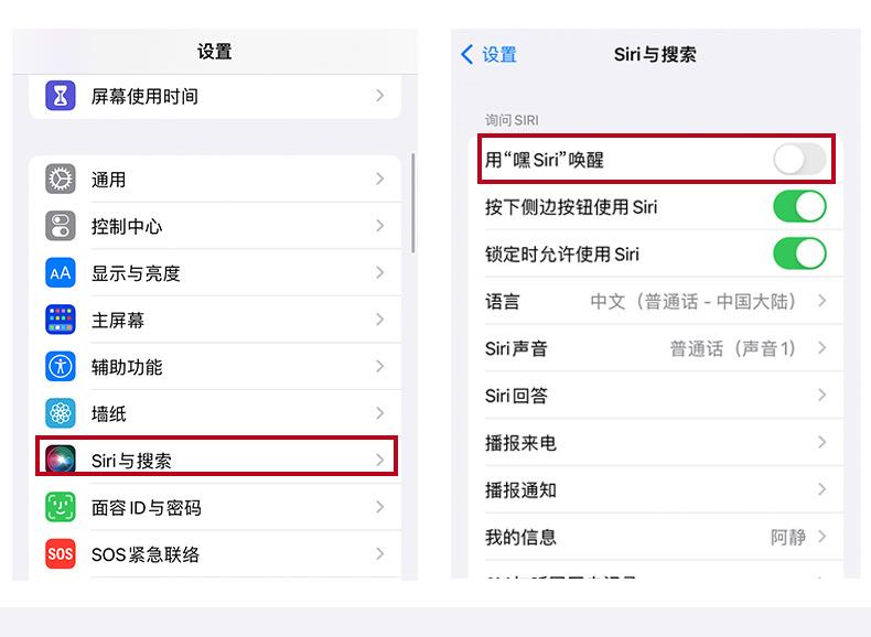 ②打开【嘿Siri唤醒】右侧的开关,只要对着手机说出语音指令“嘿Siri”即可唤醒。操作示意图如下: