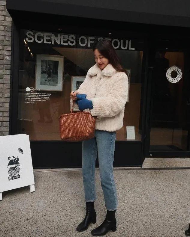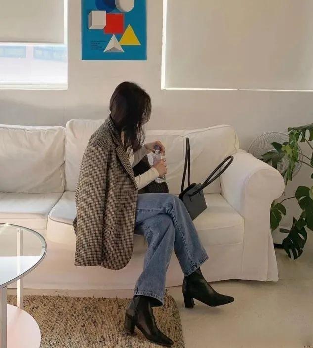 这种情况下倒不如退而求其次的选择和高腰直筒裤搭配,把紧口高筒靴换成尖嘴及踝靴,配合直筒裤的长度,轻而易举打造出轻熟淑女风,精致干练。