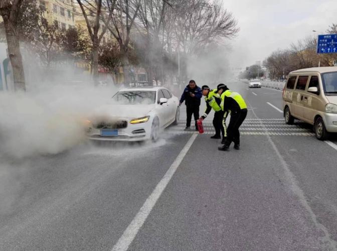 同一天,聊城城区振兴路上一辆白色小轿车突然起火,浓浓烟雾中,聊城交警直属二大队铁骑队员们第一时间拎起灭火器,先后飞奔过去。队员们一边疏散围观群众,一边熟练地用灭火器灭火,用完自身携带的后,队员们还向周边商铺和过往车辆借来灭火器,当六只灭火器全部用完,浓烟渐渐消散,车上的火也终被扑灭。