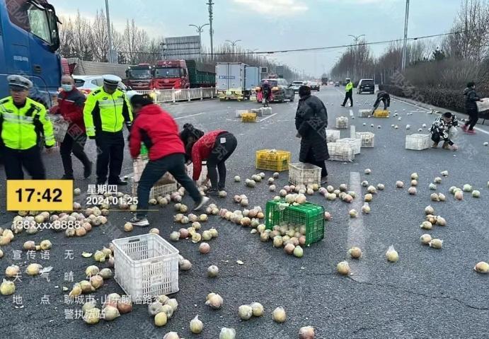 1月25日下午,在城区站前北街与聊临路路口处,一辆装满苹果的厢式货车因车门未关好,在右转弯时导致苹果成筐掉落,苹果散落一地,散落的苹果、筐子堵塞着大半个路面。当时正在聊临路口晚高峰执勤的执勤三中队民警宋书阁,辅警乔洪军,王玉伦,谭登成,王恩仁发现这一情况,毫不犹豫地分组行动,一组在现场紧张地疏导交通,指挥车辆安全通行,另一组立即行动起来,帮助群众捡苹果,与群众合力将散落的苹果装到筐里,并把装筐的苹果整齐地抬至车上。事后,驾驶人感激地说道:“交警同志,今天多亏有你们了,如果没你们帮助,我还不知道清理到啥时候了,真是太感谢你们了!”