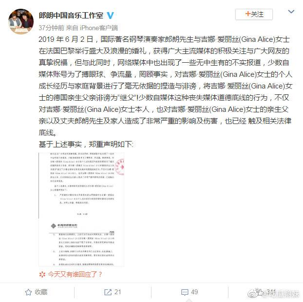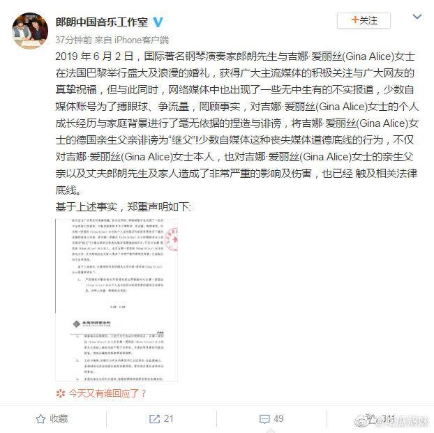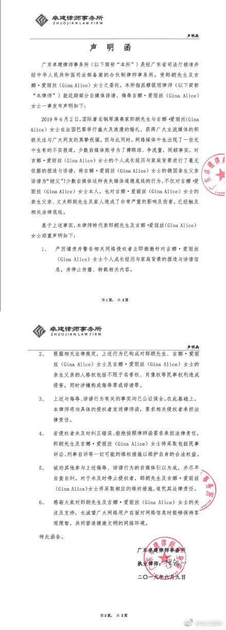 网传吉娜·爱丽丝并非真正混血,德国父亲只是继父,郎朗工作室辟谣称是诽谤,还甩出一张律师函