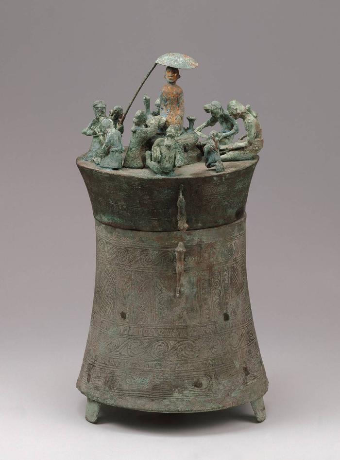 三星堆遗址八号坑出土的铜人面具,其宽颐广额,面庞夸张,凸目大鼻阔耳的典型特征,体现着古蜀先民对自然万物与人神世界的理解与思考。相较之下,来自云南李家山的青铜器则风格写实,表现出浓郁的生活气息。譬如在展厅显眼处亮相的纺织场面铜贮贝器,器盖上铸十人组成的纺织场面,表现了一位贵妇监督一群女工用原始的腰机艰苦织布的场面。