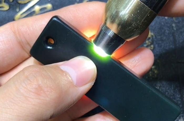 首先看这一个墨碧的料子。吃光度非常低,大概在一个毫米左右的样子。再看这个料吃光度就比较深了,有墨碧的3倍左右的吃光度,通过吃光度做一个最基本的判断,并且它们底色是不一样的。墨碧是碧绿色的,另一个是青底,这就是青玉和墨碧的区别,如果大家在判断黑色和田玉它是否是墨玉,还是墨碧,还是黑青,可以通过打光看光圈的颜色就可以充分判断了。
