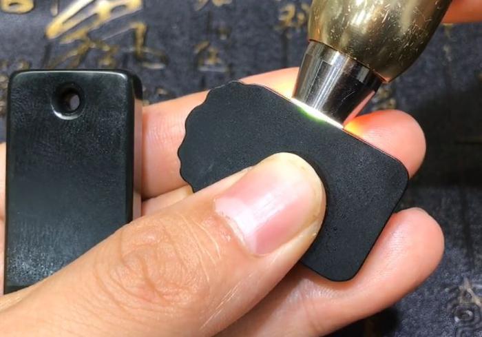 右边这块料子是一个墨碧的料子,左边这个料子是一个青海的青料子,是个黑底清,它们属于一系的料子,外观看的话是非常非常相近的,看着相近不代表它是一样,在和田玉中是表现得淋漓尽致的大家一定要注意,下面通过打光图片来看一下吃光度,大家可以做一个简单的区分。