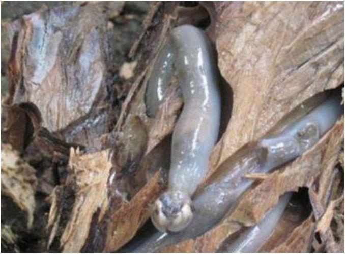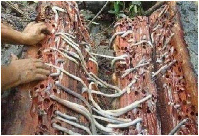 它是条状的,比金针菇要粗一些,它不像其他菌类一般都长在树根的外面,它长在树的里面,而且随着它的长大,会把树里面钻出很多小洞,等到它们都成熟可以供人食用的时候,这棵树基本上就被它们钻空了,变得非常脆弱,一碰就会裂开,所以很容易就能找到它们的踪迹。