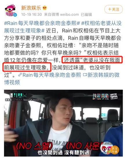是说韩国男星 Rain 和权相佑在综艺里秀幸福,权相佑脱口而出“结婚 12 年,老婆从来没在我面前展现过生理现象!”