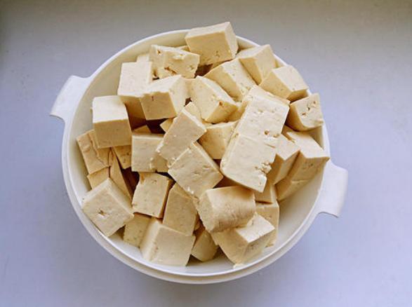 第二步、把豆腐切成1厘米厚的方块,不能太薄,越厚网状结构越多。