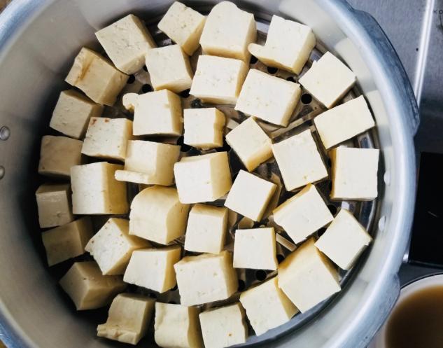 第三步、把豆腐片放进蒸锅里,不要叠放,水煮开后大火蒸20分钟,去除多余的水分。