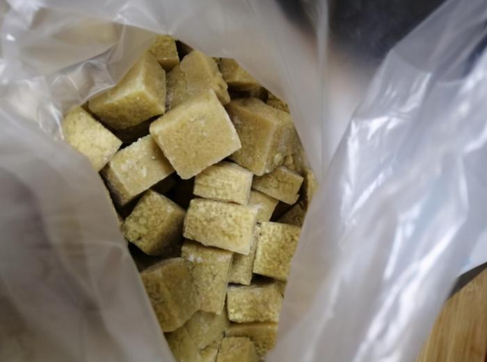 第五步、将冻豆腐取出,用保鲜袋装起来,再放进冰箱里冷冻保存,吃的时候拿出来解冻即可,可以油炸、炖菜、涮火锅、炖汤,口感都特别好。