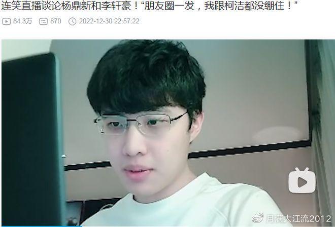 连笑在一期直播中谈到了杨鼎新和李轩豪的友谊,说杨鼎新是李轩豪最好的朋友。谈到杨鼎新为什么这样对待李轩豪的时候?连笑说他不认为是杨鼎新的嫉妒,因为如果是嫉妒的话,那柯洁在大赛上淘汰了我这么多次,我是不是应该拿一把小刀在后边捅他?虽然是一句调侃的玩笑话,但也透露出连笑对面对柯洁时的无奈。