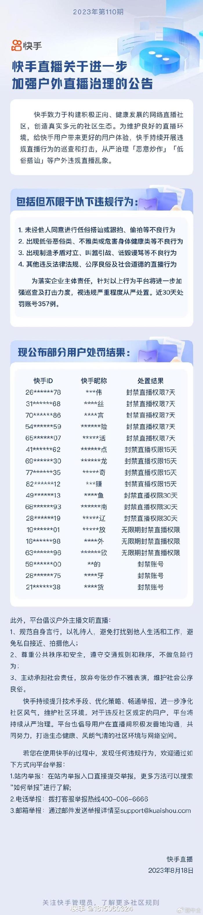 补充:快手刚刚发布加强户外直播治理的公告。快手表示,将持续开展违规直播行为的巡查和打击,从严治理「恶意炒作」「低俗搭讪」等户外违规直播乱象。