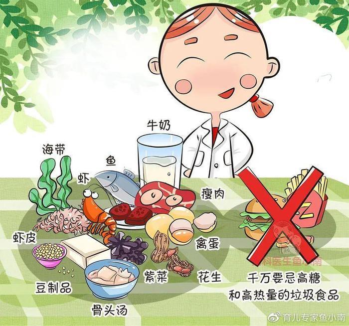 小南建议:像鱼、虾、瘦肉、禽蛋、花生、豆制品这些蛋白质含量丰富的食物,还有含钙、磷丰富的食物:牛奶、虾皮、豆制品、骨头汤、海带和紫菜都是不错的选择。