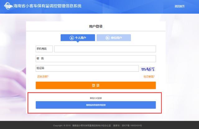 若是曾经在“海南省小客车保有量调控管理信息系统”注册过的用户,可以按照原有方式进行登录,“手机号”+“密码”的方式登录海南省小客车保有量调控管理信息系统;若是直接在“海南省统一认证平台”进行注册的用户,选择“海南省政务服务网登录方式”,通过“证件号码”+“密码”的方式登录海南省小客车保有量调控管理信息系统。通过“海南省政务服务网登录方式”的具体操作流程如下: