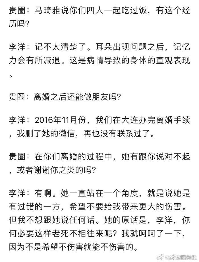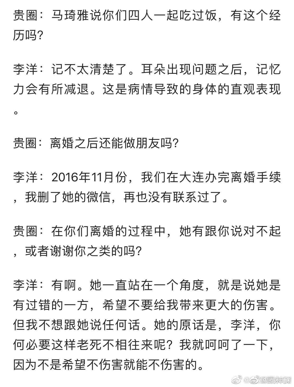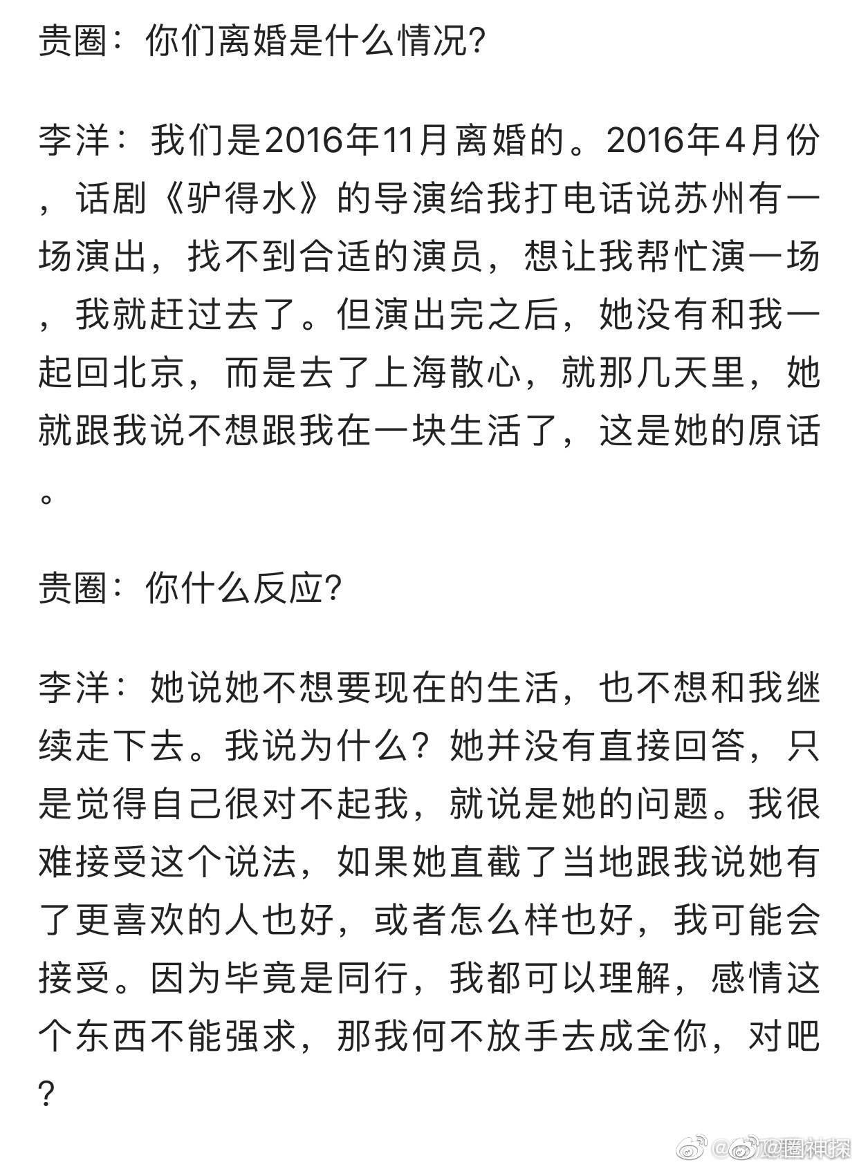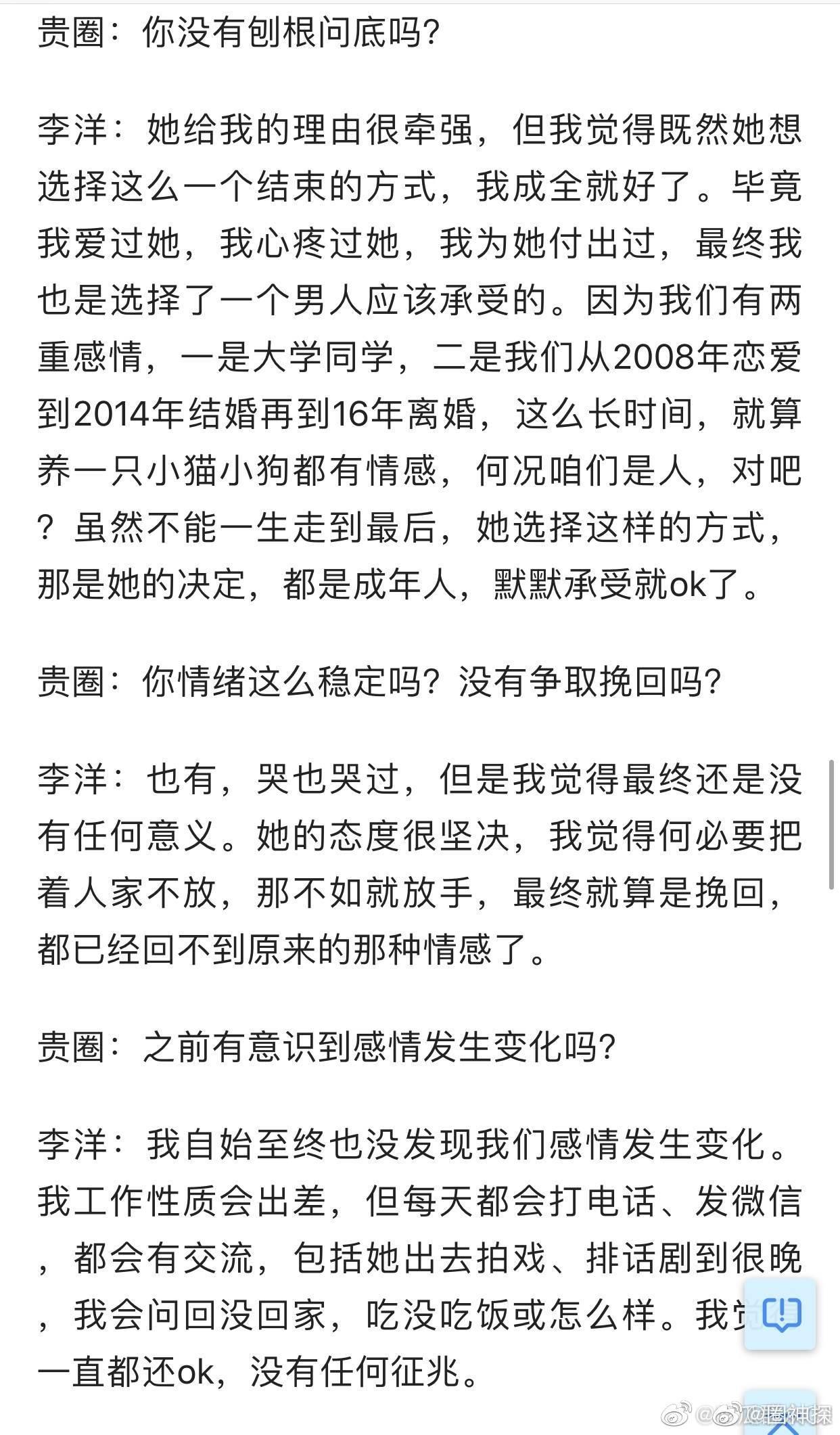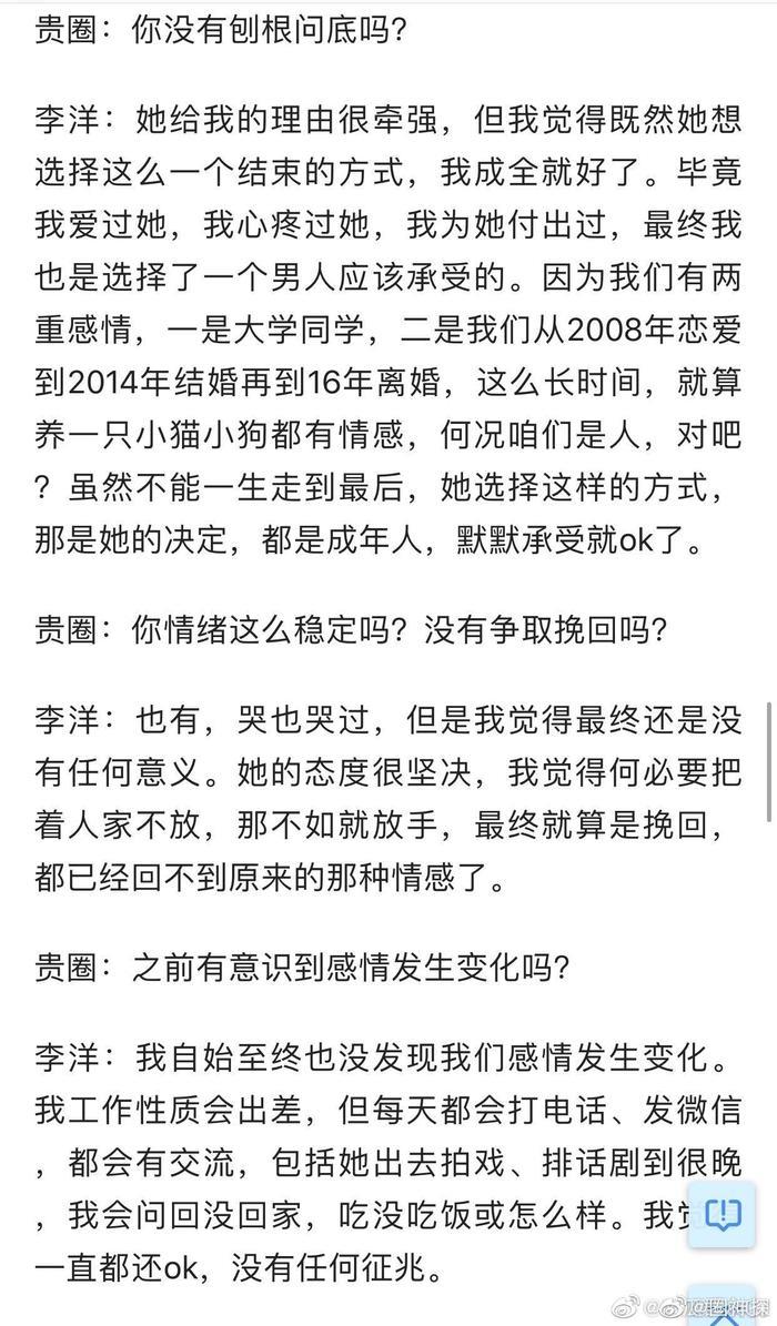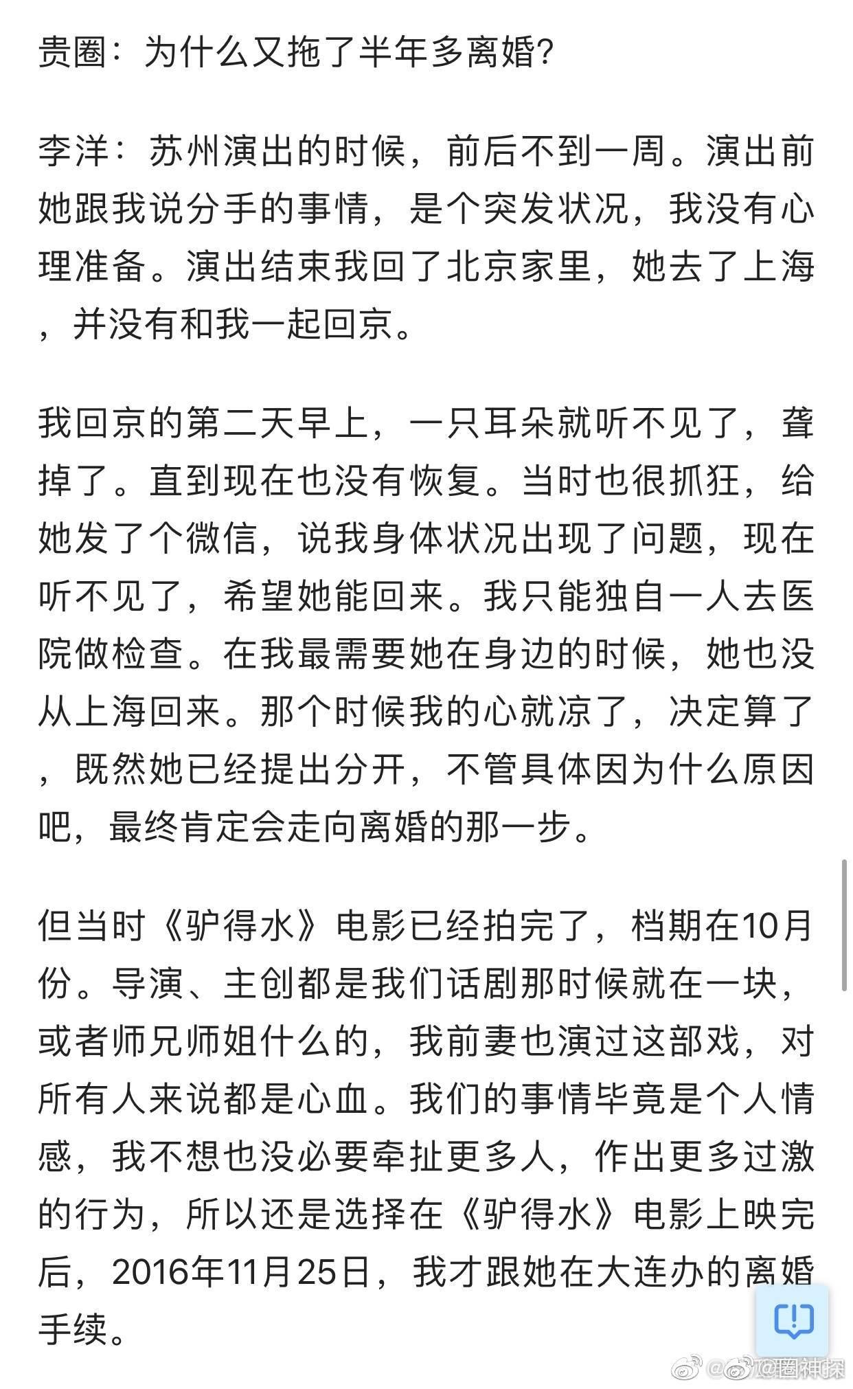 贵圈采访任素汐前夫李洋,前夫证实任素汐出轨,信息量很大。他称自己与任素汐14年领证,16年4月任素汐突然提出离婚,这刺激令他一只耳朵失聪到现在还没恢复。李洋透露之所以接受采访是因为这两天身边的共同朋友同事都来说情,让他不要发声,令他感到又一次伤害。离婚后他就删了任素汐,没再和她联系,她一直希望不要再给自己带来伤害,原话是“李洋,你何必要这样老死不相往来呢”。但李洋觉得,不是不希望伤害就能不受到伤害的。