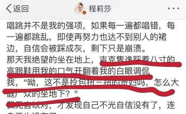 节目播出后,程莉莎在微博发表了小作文。全文她强调了自己在不擅长的跳跳舞台上感受到了前所未有的快乐,也在一个又一个的挫折面前失去了自信和自我。其中,关于吉克隽逸的一句调侃,引起了吃瓜群众的抨击和讨论。