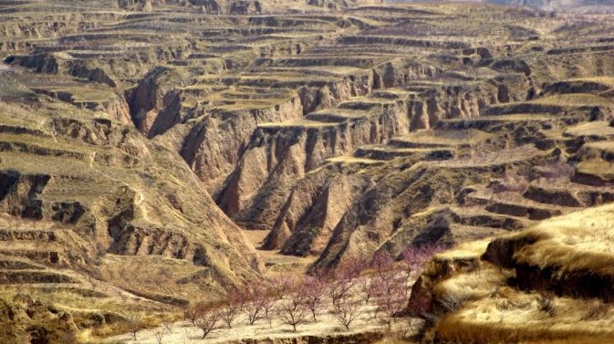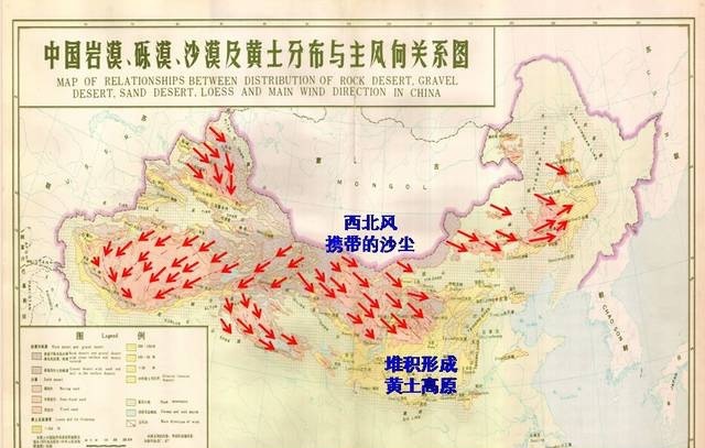 中国的黄土堆积区域,正是盛行下沉气流、有利于粉尘降落的地方。在中国地图上,大致可以自西向东看到戈壁一沙漠一黄土这样岩石沉降颗粒逐渐变小的顺序。黄土高原,是几百万年的“沙尘暴”堆积的结果。