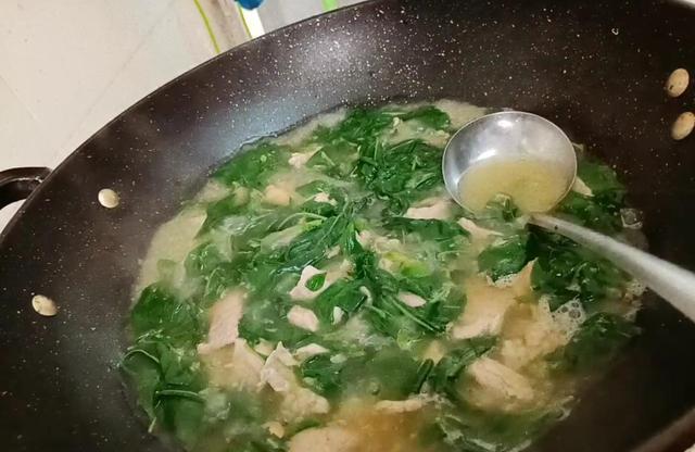 第三步:瘦肉煮两分钟后,放入少许花生油,接着放下枸杞叶,把枸杞叶搅拌到汤里去,中火煮五分钟。