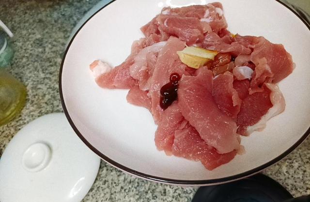第一步:买回来的瘦肉清洗干净,切成片,然后加入两片姜片,蚝油少许、白醋少许、料酒少许、生抽少许,搅拌均匀腌十分钟。