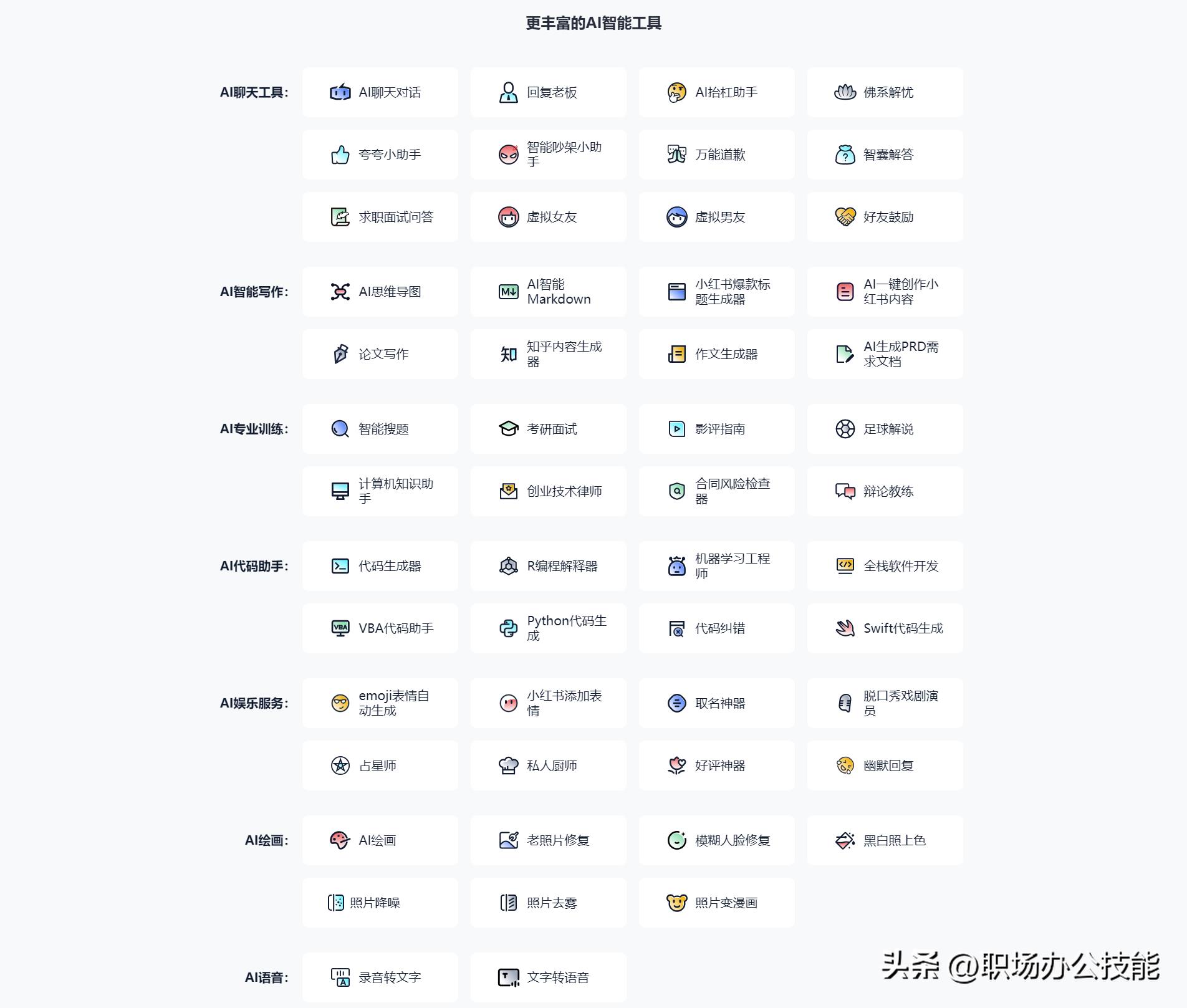 一个AI助手工具,它不仅支持AI问答,还有智能写作、AI专业训练、代码助手、AI娱乐、AI绘画和AI语音的功能,每个分类下都有不同的小功能可以使用,一共有几十个功能,非常全面。