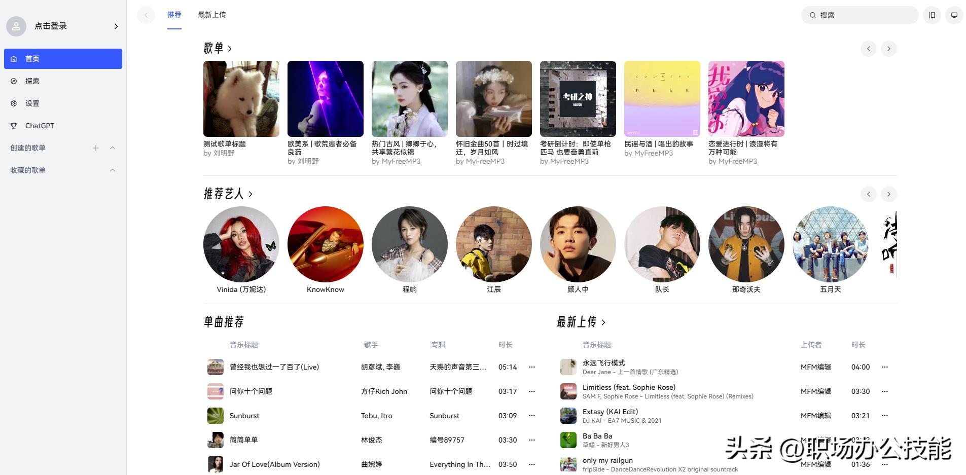 一个音乐免费下载网站,首页会推荐一些歌单、艺人和单曲,也可以直接搜索音乐,直接点击就能在线播放了,平时听歌用它非常方便。