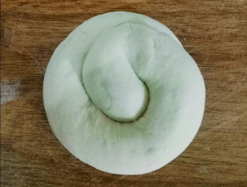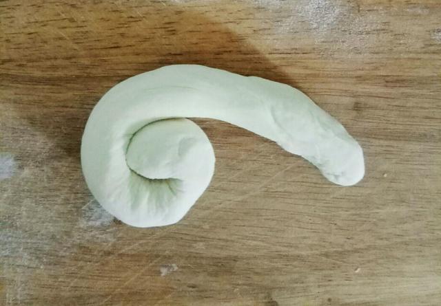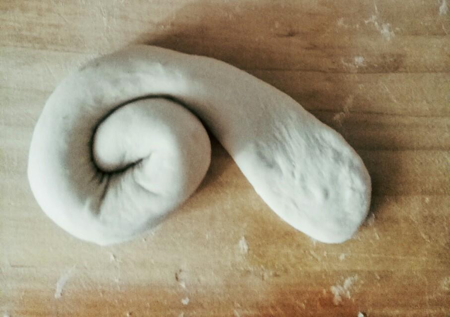 4、搓长条揪成大小合适的剂子,每个剂子搓成长条,从一头卷到尾,把尾巴压扁在面团下。