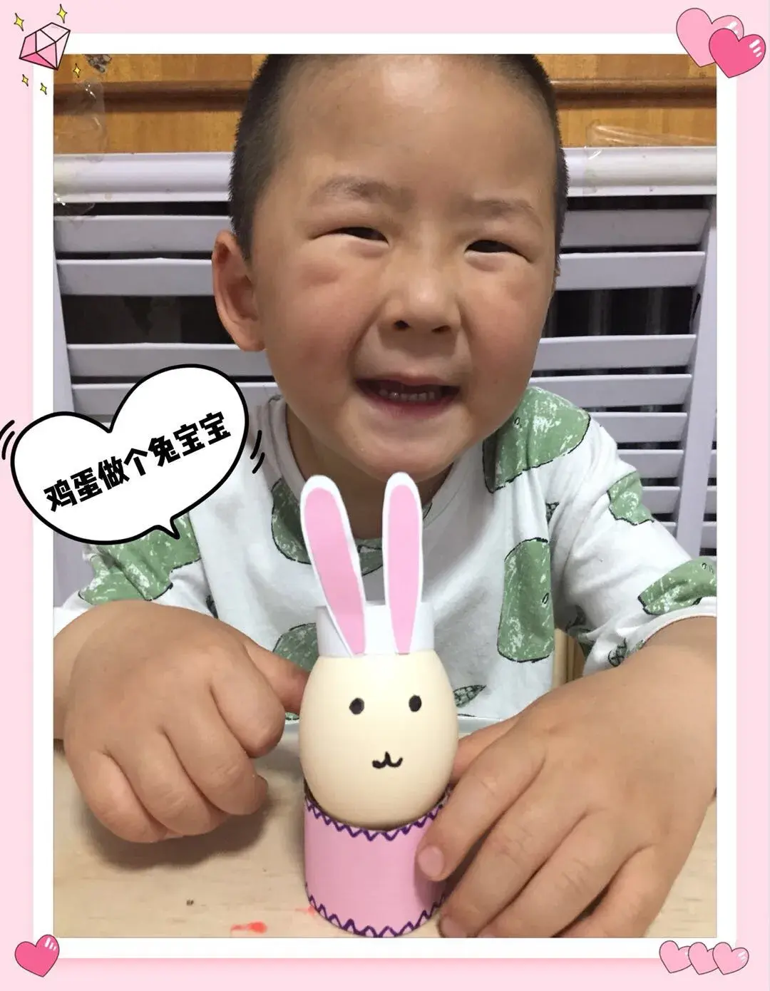 早上开始幼儿把蛋放在袋子里或蛋兜里,在家一天中亲子比比谁的蛋是完整的、没有破损的,评比出了家庭“护蛋小天使”。