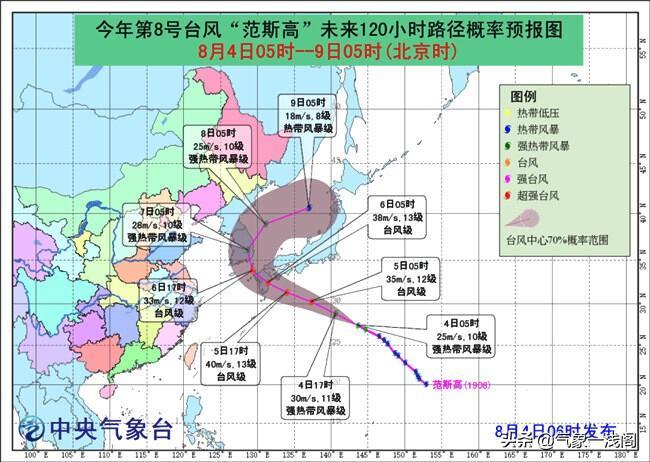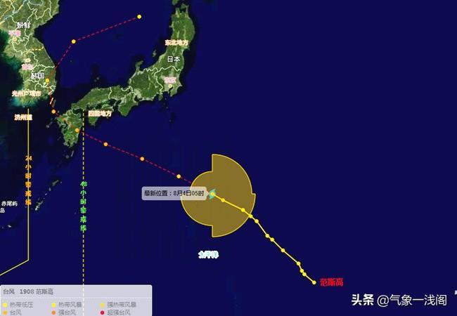 权威最新预报:8号台风范斯高升至10级,第一次大转向开启,未来还有3次大转弯,或将影响东亚四国。具体的,我们先看最新数据,4日上午5时,我国中央气象台播报,台风范斯高前行到了日本东京东南方向995公里的洋面上,离西北方向我国的上海市约2220公里,具体坐标为27.4N,143.6E,中心最低气压985百帕。