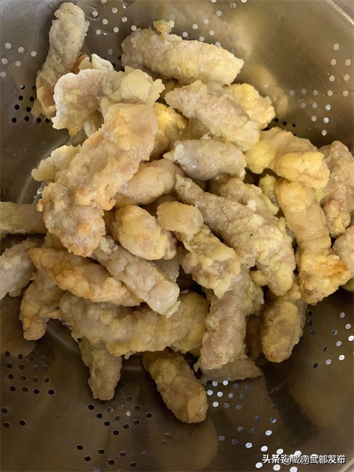 4、锅中倒入足量油,烧至五六成热,将裹好面糊的里脊肉逐片放入锅中,用中小火炸至表面金黄酥脆,捞出沥油。