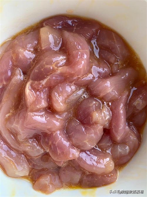 1、将猪里脊肉切成长约5厘米、宽约2厘米、厚约0.3厘米的长方形片,放入碗中,加入料酒、生抽、盐搅拌均匀,腌制10分钟。