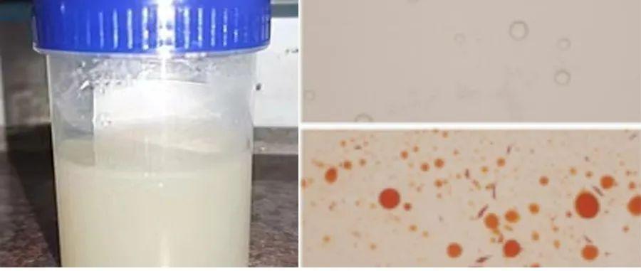 米汤样尿液2周。无发热、尿频、尿急、尿痛、腹痛、腰痛等其他不适。晨起较轻,活动后明显。