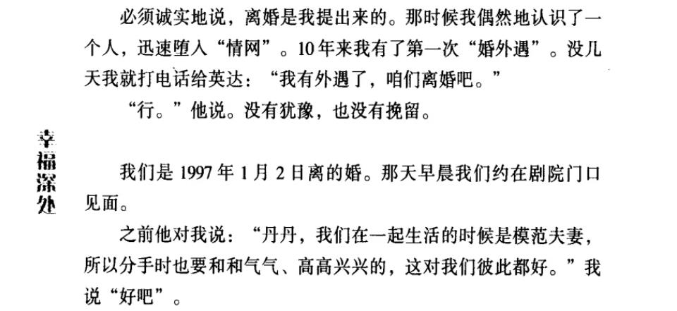 1997年,37岁的宋丹丹拨通丈夫英达的电话,平静地提出离婚,原因是她已与他人建立感情。英达对此并未表现出强烈的情绪反应,两人三天后迅速办理了离婚手续。在办理手续前,宋丹丹询问英达是否和梁欢有染,英达否认。然而,离婚后宋丹丹在英达遗落的呼机上发现大量梁欢的留言,这才明白英达早已出轨,他在婚姻中扮演了背叛者的角色。