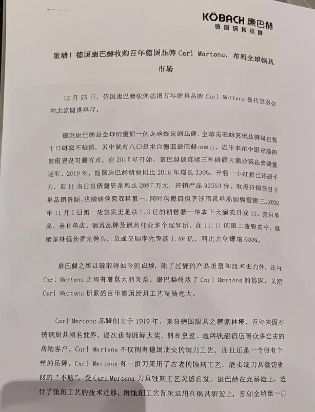 不过近一年来,关于康巴赫百年历史和源自加尔米施小镇的文章和视频似乎已经消失了不少,与此同时,一则康巴赫收购高端刀具界百年德国品牌Carl Mertens的消息进入了媒体的视野,看来,康巴赫努力树立“百年德国品牌”形象的决心,倒是坚定不移。