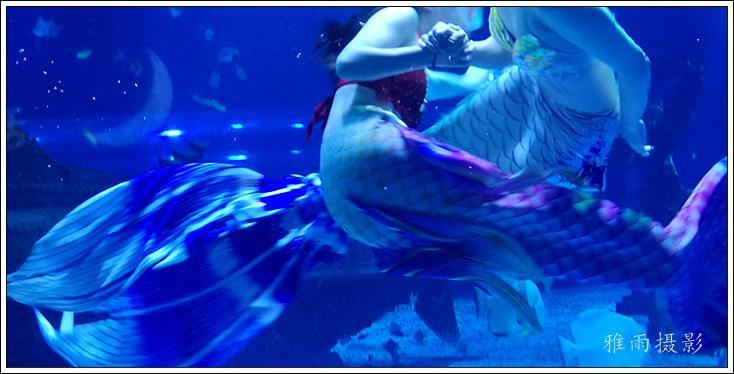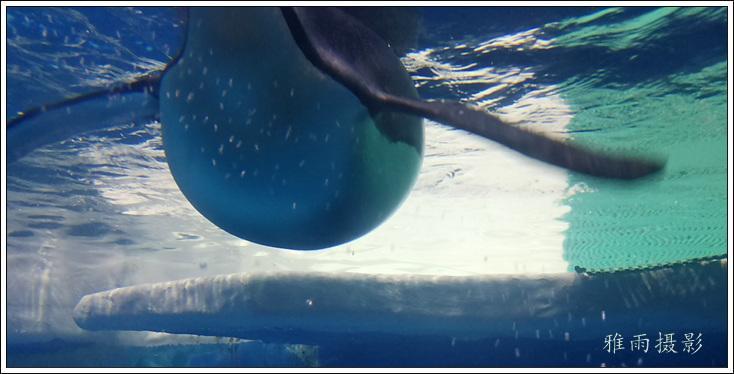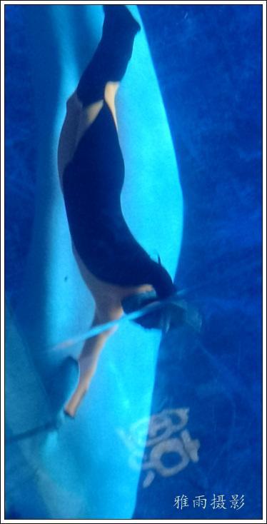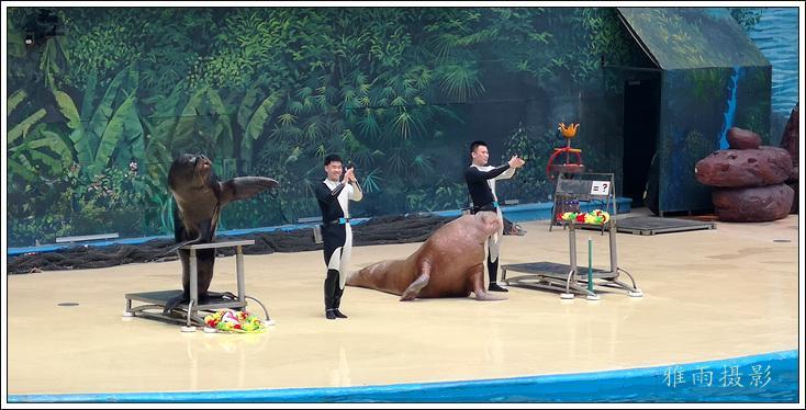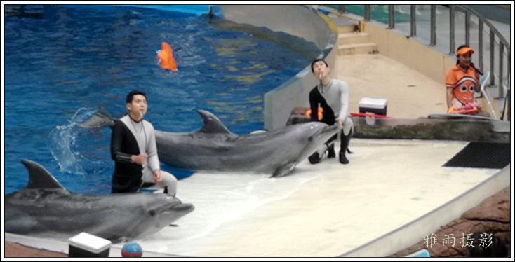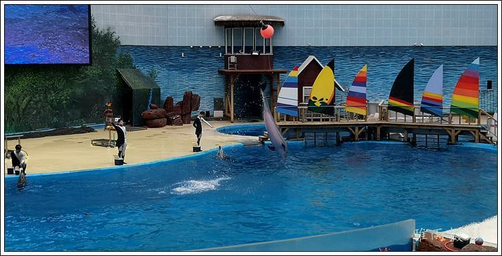 表演场有1个大型表演池,3个寄养池,200个座位,可同时300余人观看表演。游客们不仅可以近距离观微大白鲸、海豚、海狮等海洋动物的精彩表演,还可以在表演台上与海豚RK玩转呼啦圈,与海豚握手、亲吻,和它们等距离接触。
