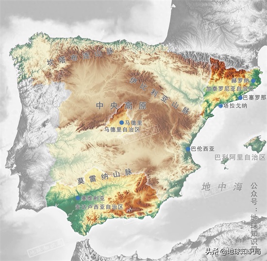 从埃布罗河流域向西看,有一座伊比利亚山脉,平均海拔只在1000多米,但已经足以形成地理上的屏障。翻过这座山脉,才能到达西班牙中部的中央高原(又叫梅塞塔高原)。两者在古代的交流相当有限,这才让加泰罗尼亚语为代表的本土文化有了长期扎根的空间。