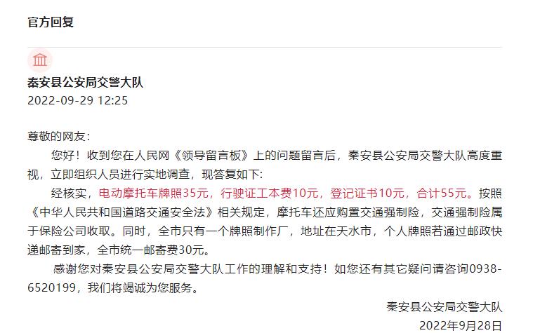 不同地方上牌分费用有所不同,以甘肃秦安为例:电动摩托车牌费用35元,行驶证工本费10元,登记证书10元,合计55元。