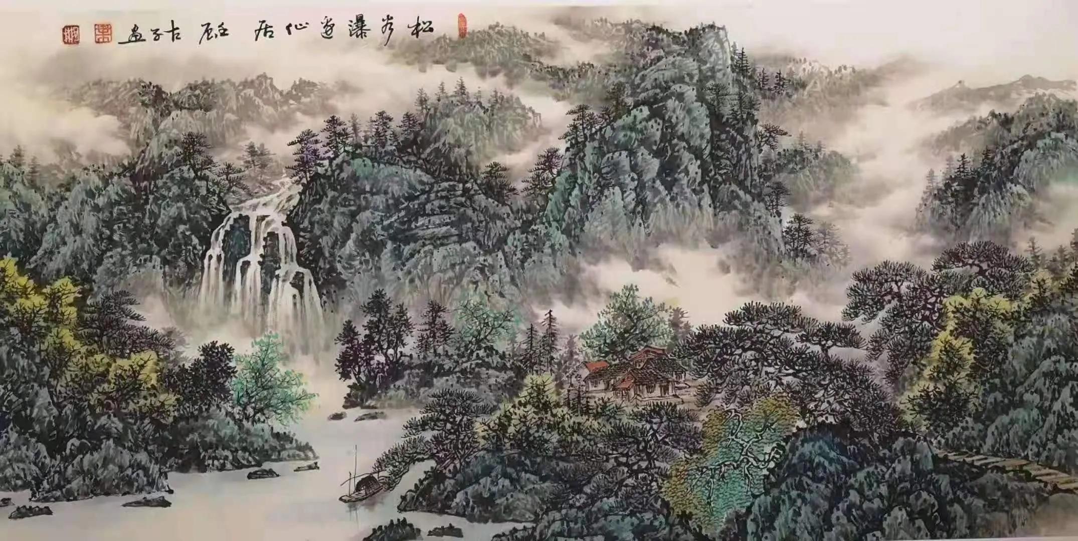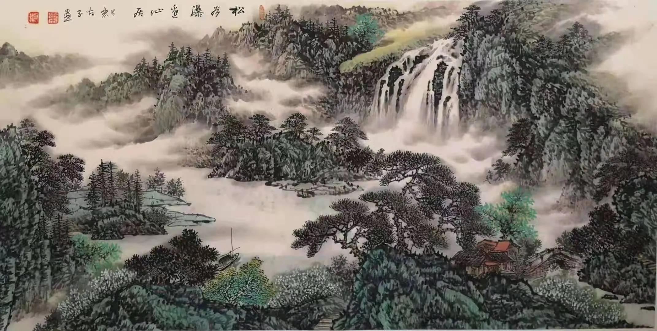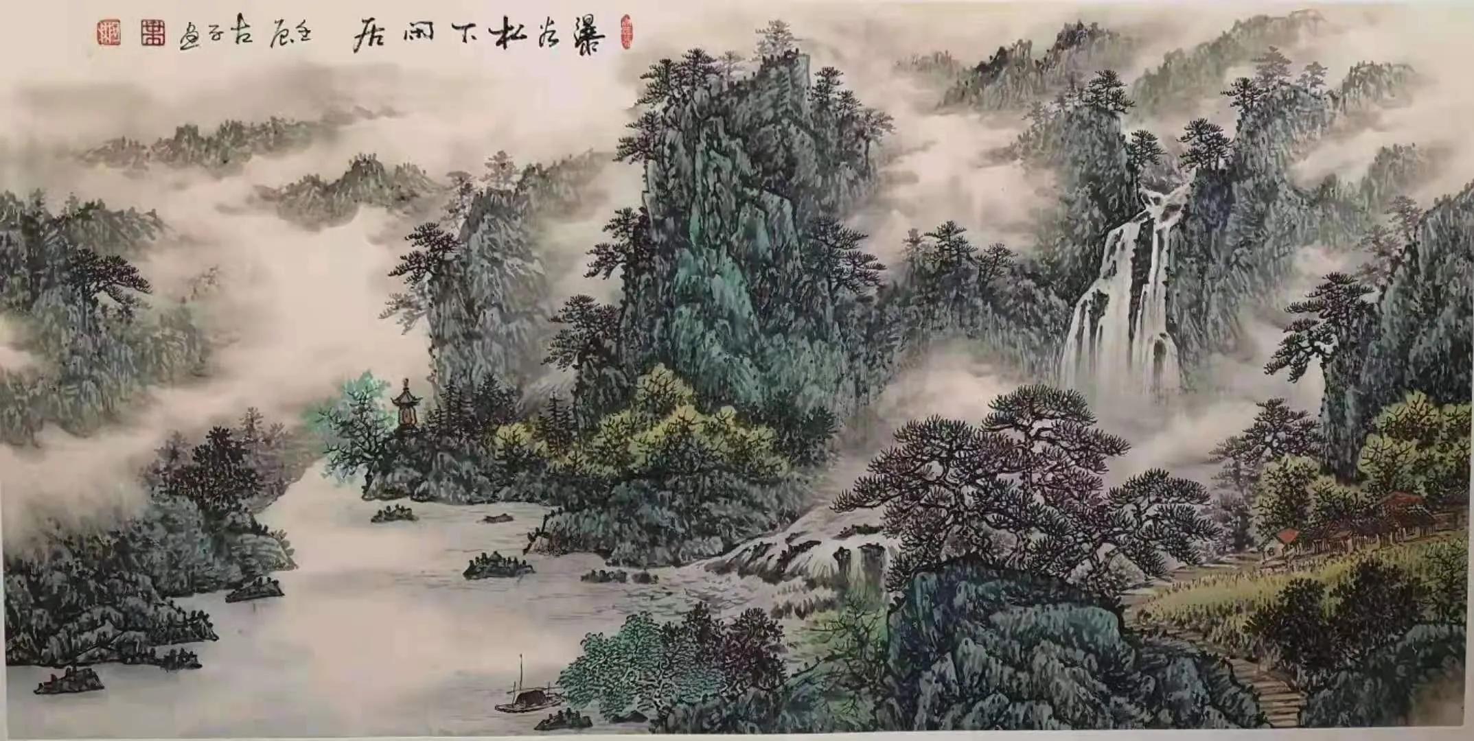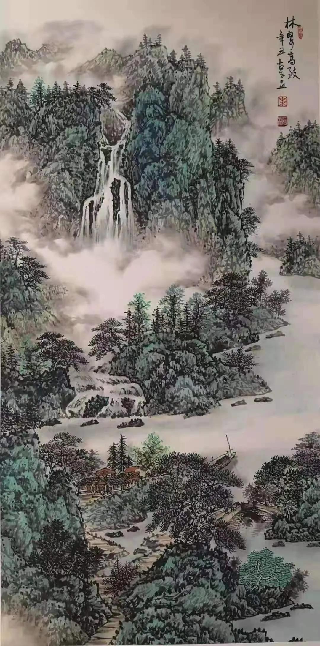 叶阿林老师擅长山水人物,亦能花鸟鱼虫。其创作往往将青绿工笔与水墨笔融为一体,立意新奇,融汇中西,追求创新而不失本然[强]。