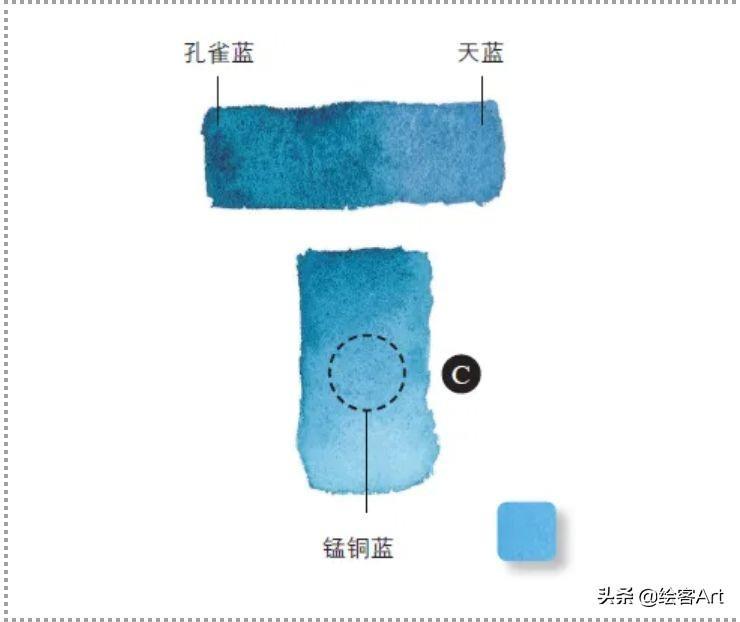 3.C是画面中上半部分的天空,我们用孔雀蓝和天蓝混合,得到颜色偏深的蓝色——锰铜蓝。用来表现近处的晴空。