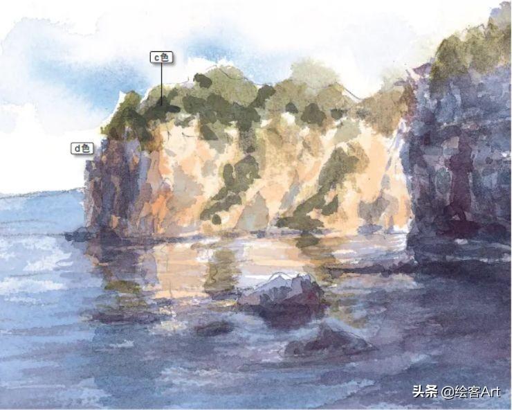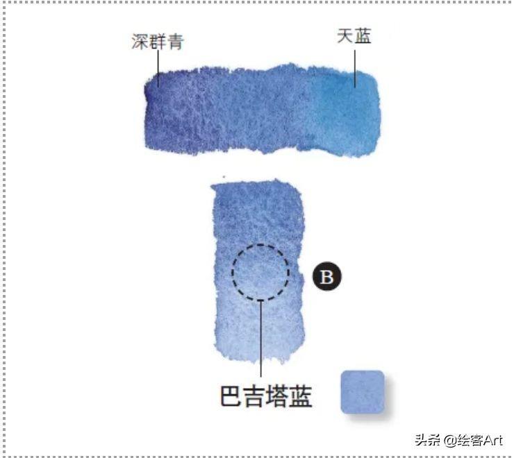 2.B是画面中下半部分的天空。我们用翠绿和天蓝混合,可以得到透明感很强的复合蓝,很适合用来表现天空的蓝色。