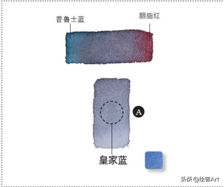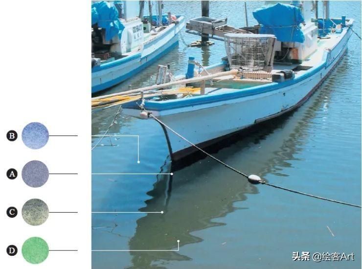 1.A是船身倒映在水面的深色部分。我们可以用普鲁士蓝与胭脂红混合,得到一种含有少量黄色的较暗的紫色。