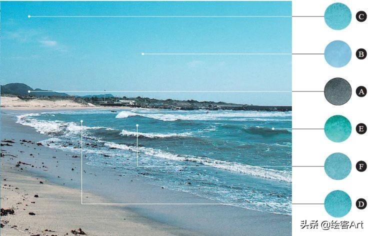 4.D是靠近海滩的海面。我们用翠绿和孔雀蓝混合,得到稳重、透明的蓝绿色,来表现近处的海面。