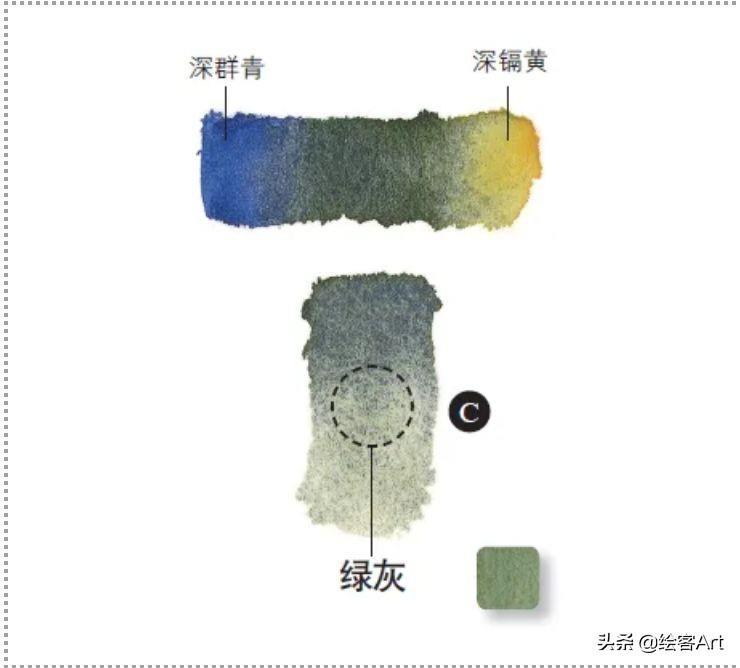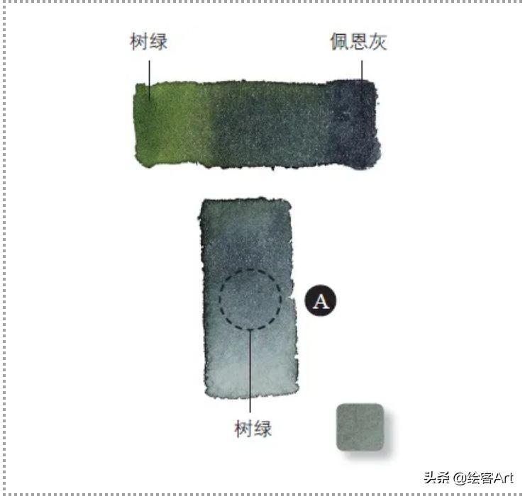 1.A是画面中远处的山。我们用树绿和和佩恩灰混合后,得到一种深邃的树绿色。用它来表现远处的群山。